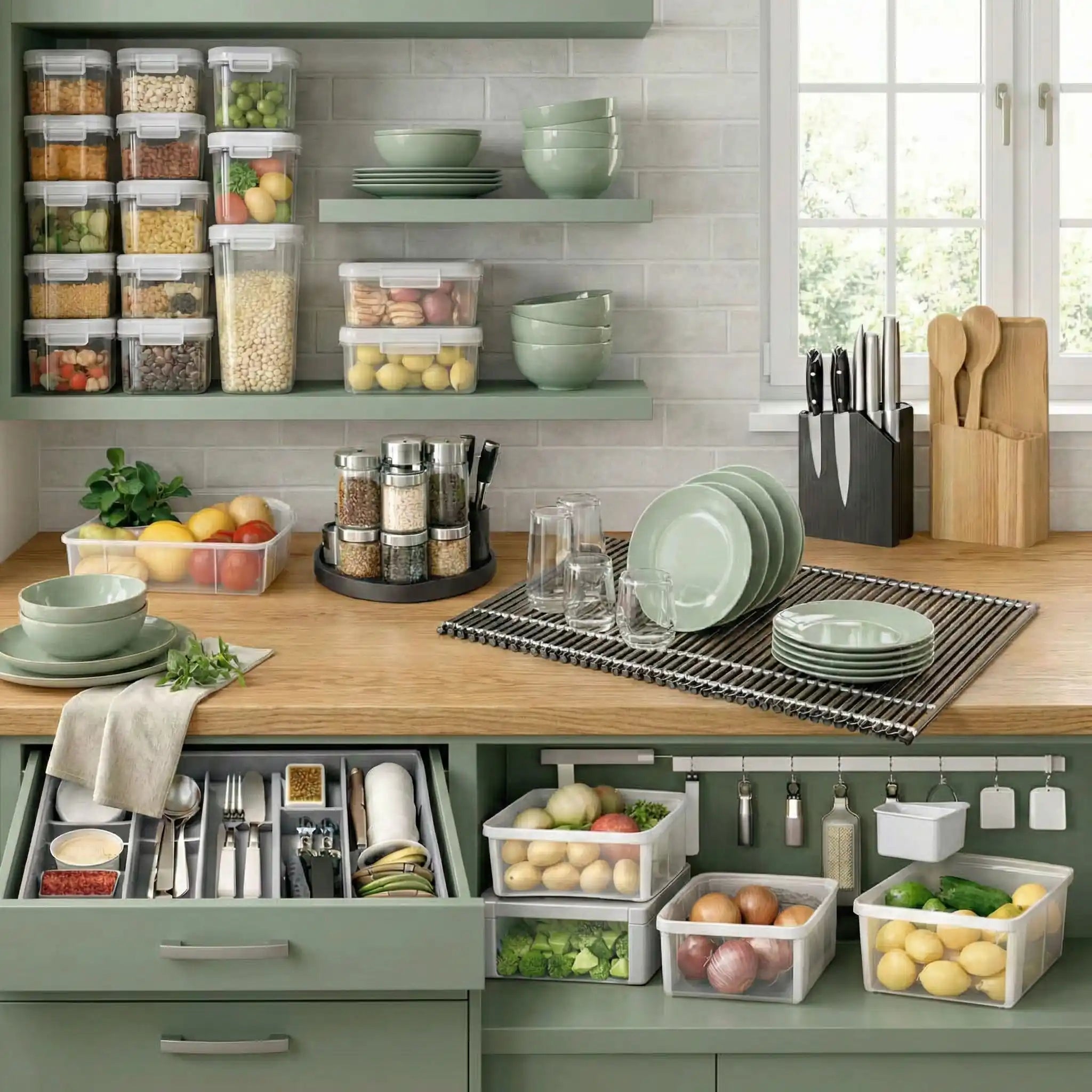 boîtes hermétiques, séparateurs de tiroirs, étagères modulables, range-épices et organisateurs malins pour une cuisine claire et fonctionnelle.